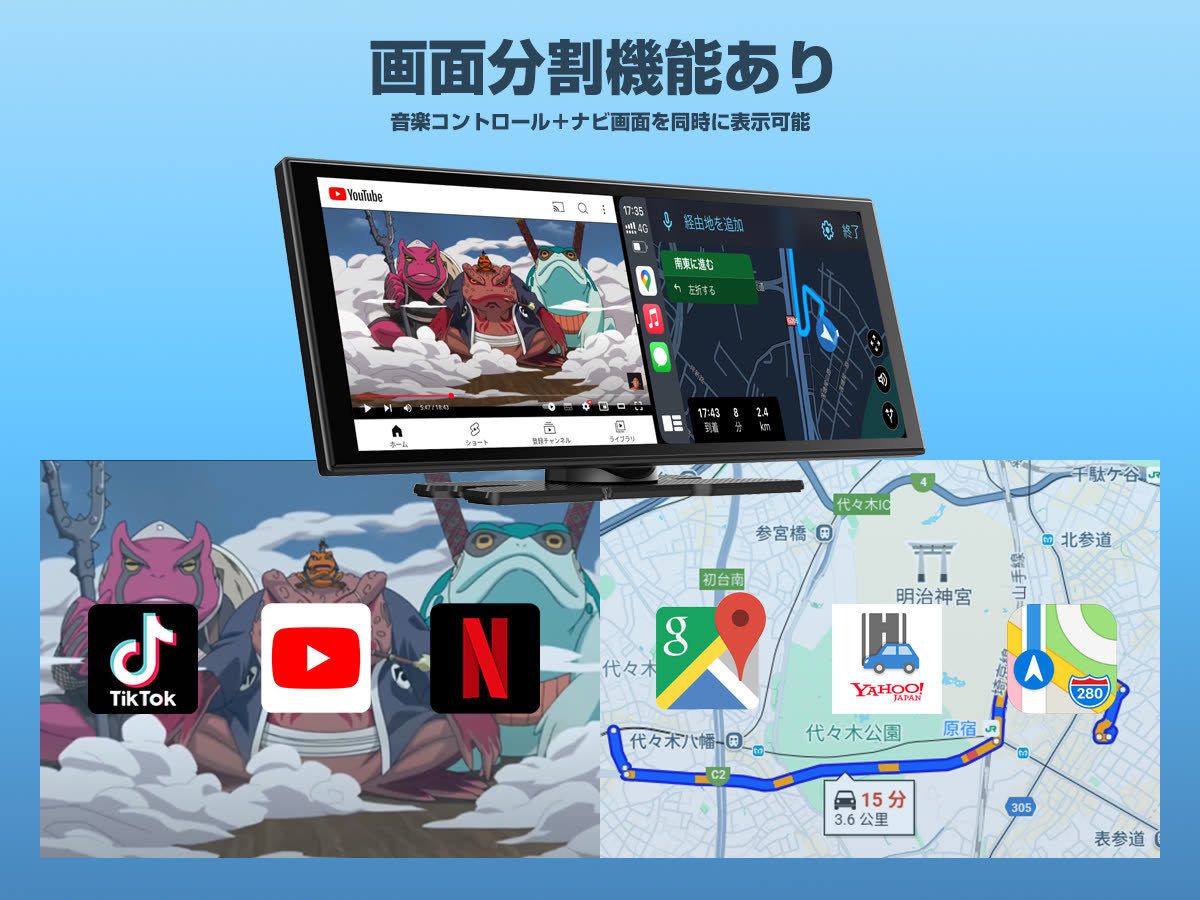 画面を左右に分割し、運転者はナビ、同乗者はYouTubeなどを同時に楽しめます。