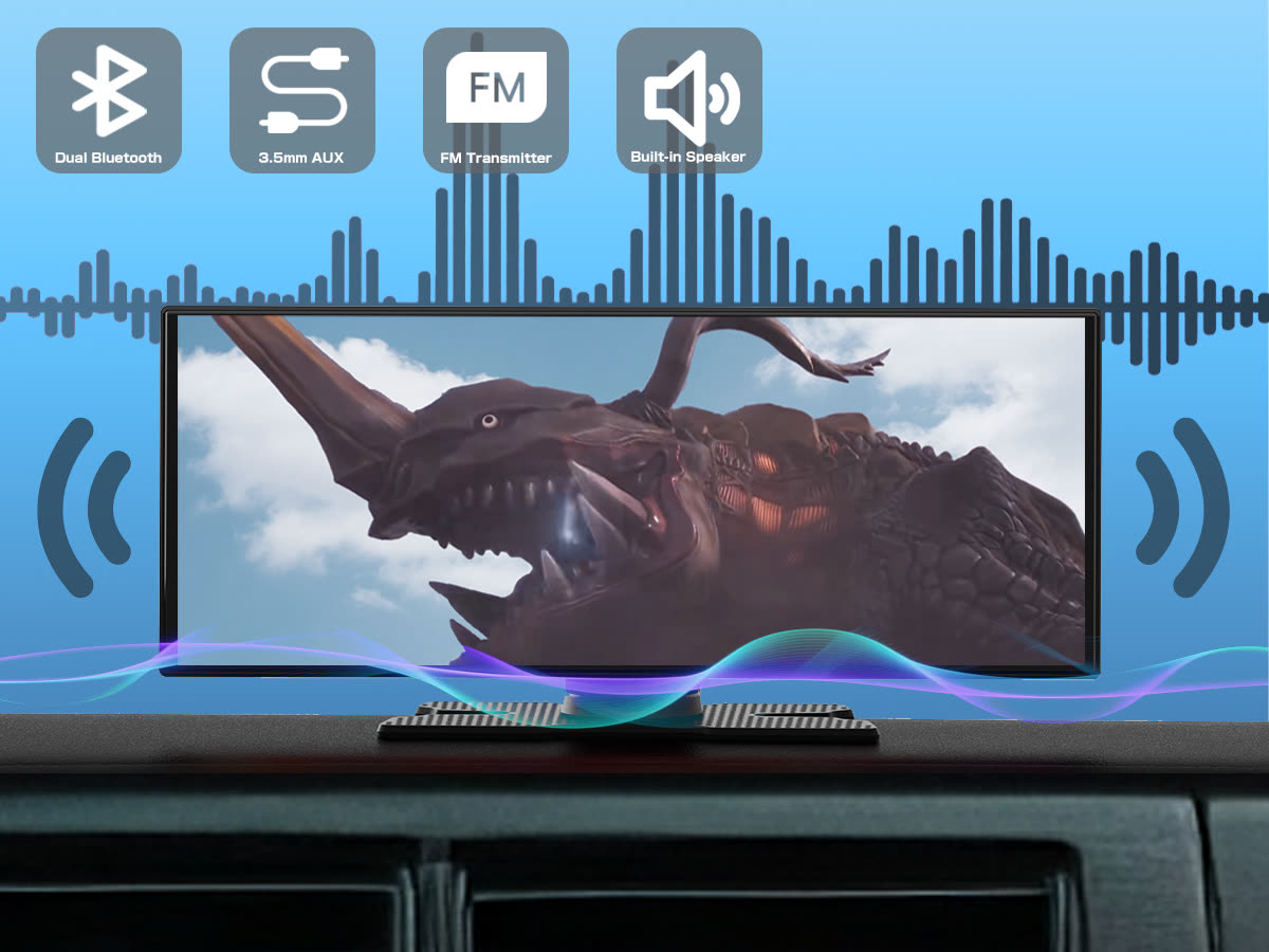 デュアルBluetoothモード・3.5mm AUX・FMトランスミッター・内蔵スピーカー の4種類の音声出力に対応し、あらゆるドライブシーンで柔軟かつ信頼できるサウンド体験を提供します